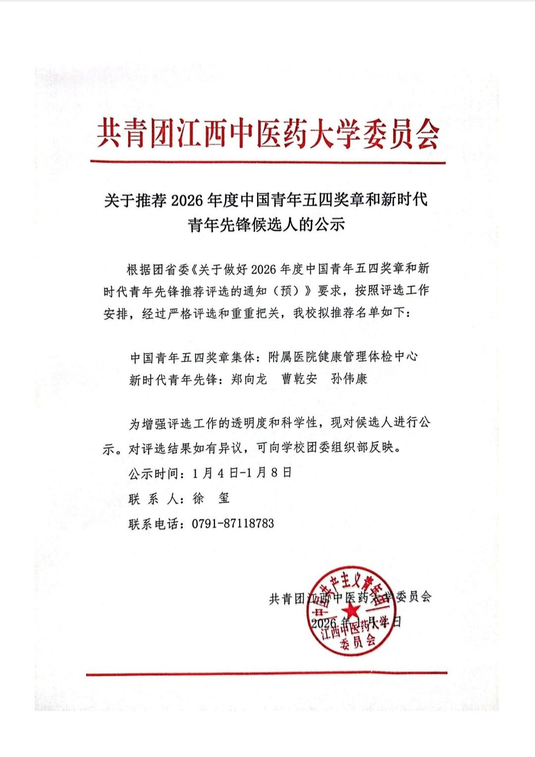 关于推荐2026年度中国青年五四奖章和新时代青年先锋候选人的公示